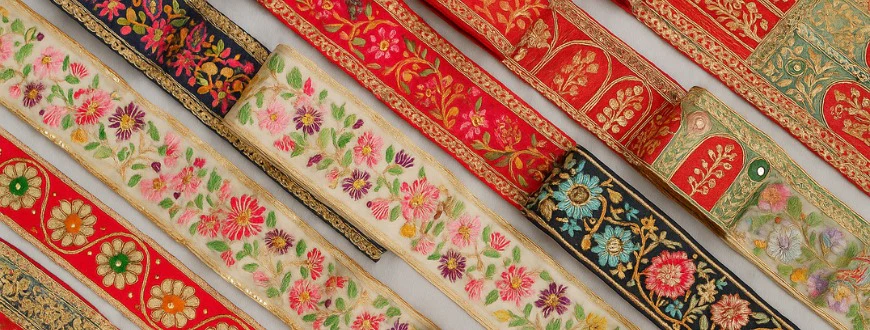 In 2025, zari borders, tone-to-tone embroidery laces, and mirror-work ribbons are leading trends. Many designers also prefer cutwork lace and cotton trims for elegant, minimalist looks.